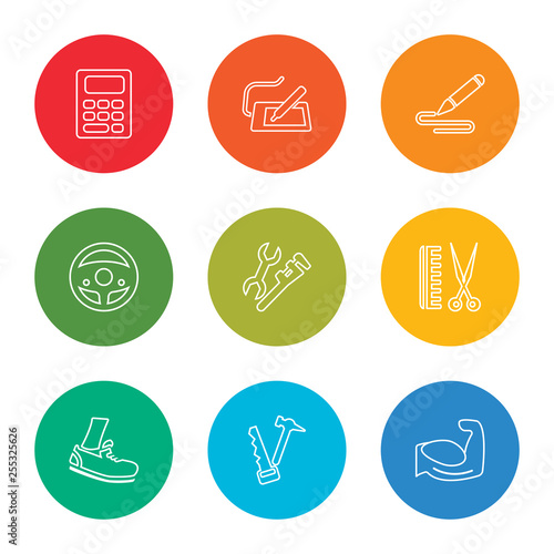 outline stroke body building, carpenter, runner, barber, plumber, chauffer, de, graphic de, accountant, vector line icons set on rounded colorful shapes