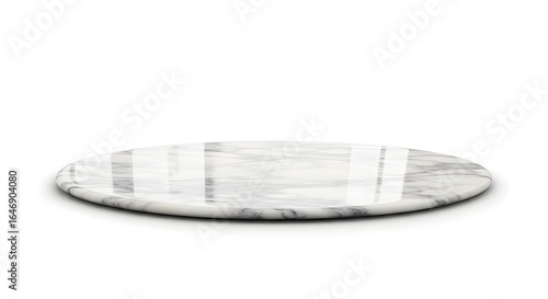 Oval-shaped marble platform with natural veining in soft grey and white hues, polished surface, subtle shadowing, photorealistic style, isolated on pure white background.