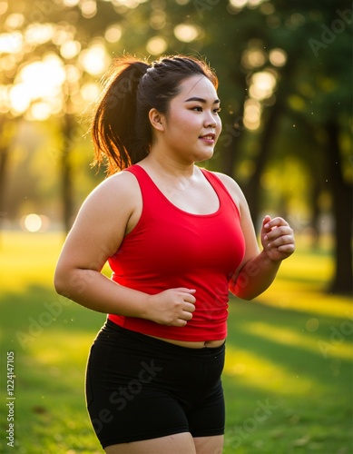 over weight young woman jogging in city park . weight loss concept . ai generative