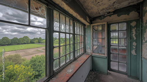 Overgrown field viewed through a window in an abandoned building.