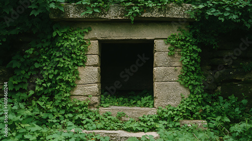 Overgrown Stone Entrance: A weathered stone structure is overtaken by lush green vines and plants, creating a mysterious and natural portal. Nature reclaiming architecture.
