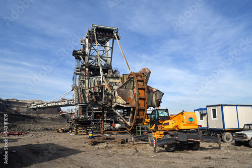 Overhaul of a large rotor excavator in an open pit mine. A large open-air construction site.