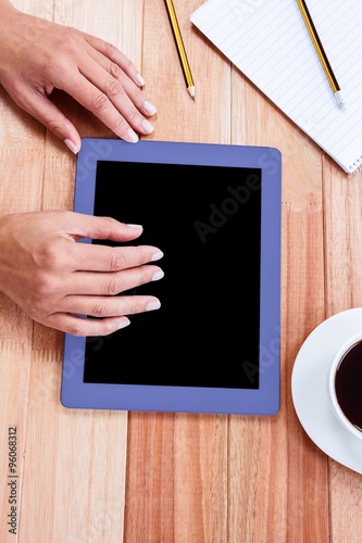 Overhead of feminine hand using tablet