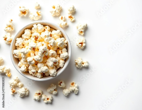 Overhead photo of popcorn bowl on white surface. Scattered kernels around a full bowl of fresh popcorn. Cinema snack food treat for movie night or a fun party.