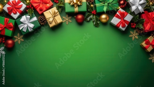 Overhead shot of diverse christmas gift boxes and traditional holiday decor forming festive arch border on green background