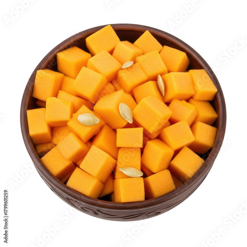 Overhead view of a rustic wooden bowl filled with bright orange butternut squash cubes and scattered pumpkin seeds against a