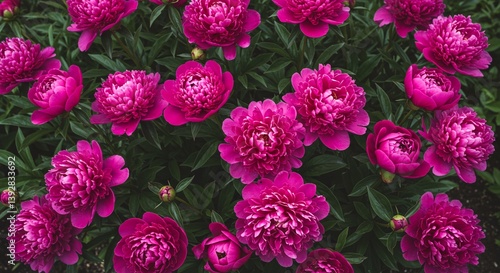 Overhead view of dark magenta peonies surrounded by lush green leaves