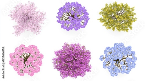 Overhead view of six flowering trees, spring, nature, garden design