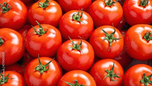 Overhead View of Vibrant Red Tomatoes with Green Stems in a Tightly Packed Arrangement Fresh Produce Still Life Food Photography