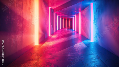 Overlay rainbow effect, neon light in a room abstract background ,Blue and pink neon light background scene, Studio empty display products. Gradient wallpaper and floor