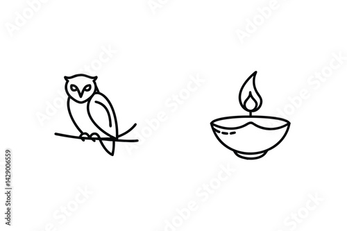 Owl And Diya Linear Icons Set, Wisdom Symbolism