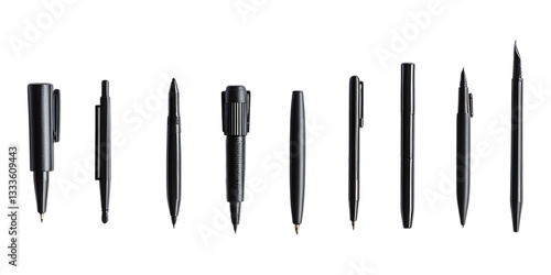 A variety of modern black writing instruments are displayed in a neat row for office supply marketing against white.