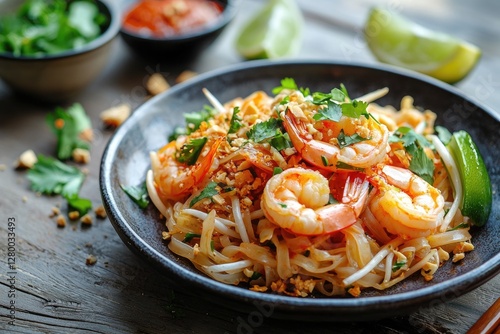 Pad Thai, stir-fried rice noodles with shrimps and vegetables