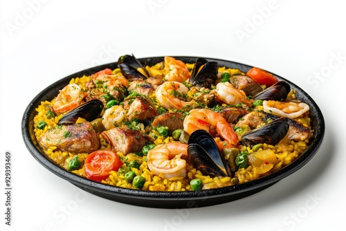 Paella , A rice dish originally from Valencia, made with a variety of seafood, meat (such as chicken or rabbit), vegetables, and seasoned with saffron and other spices. Isolated on White Background