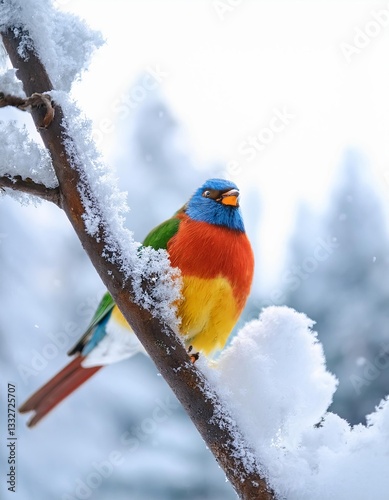 Painted bunting perching on snow covered branch in winter