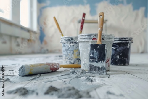 Painter Tools. Home Renovation Work in Progress: Indoor Interior Space with Equipment and Construction Tools