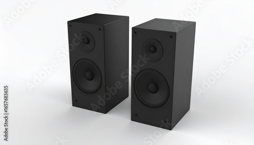 Pair of black rectangular speakers with dual circular drivers, matte finish, isolated on white background.