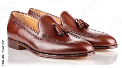 Pair Of Brown Leather Tassel Loafers Polished Men's Dress Shoes On White Background. High End, Classic Footwear For Formal Occasions. Detailed Close