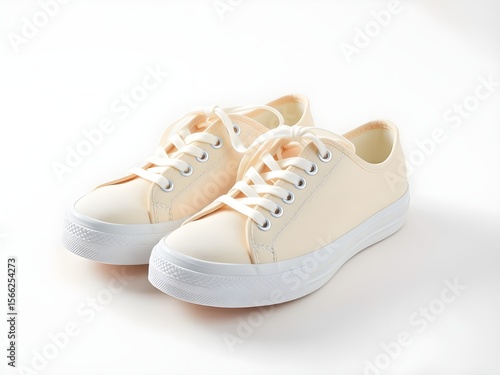 Pair of Clean New Beige Canvas Sneakers with White Laces and Soles on a Bright White Background, Perfect for Casual Fashion and Footwear Concepts