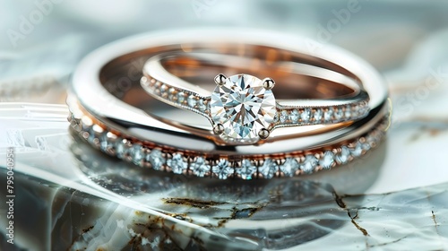 Pair of elegant wedding engagement ring macro image.