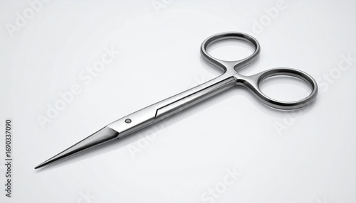 Pair of fine‑pointed stainless steel surgical scissors with circular finger holes and long narrow blades, designed for precision cutting in medical or laboratory use, on a plain background.