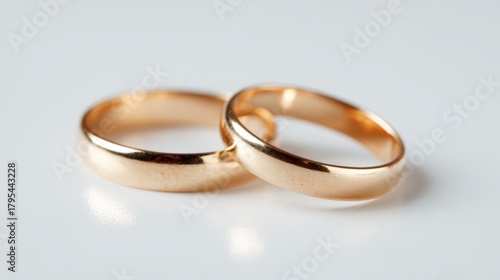 Pair of gold rings on clean white backdrop, symbolizing marriage bond and everlasting love