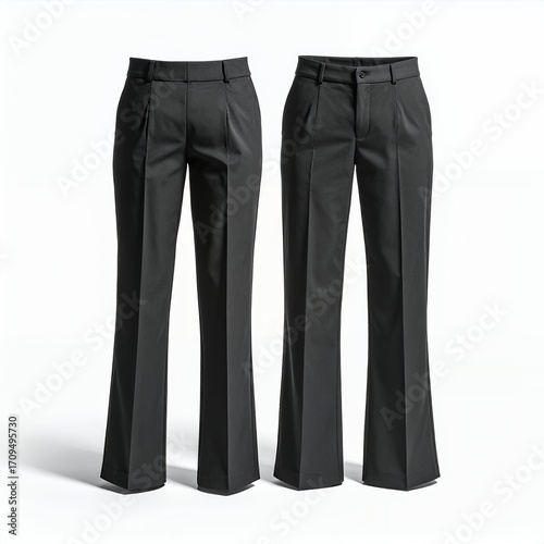 Pair of neatly arranged dark trousers on white background offer a formal look