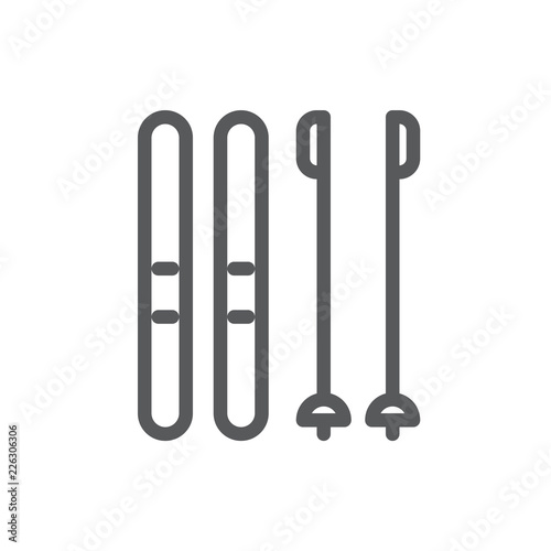Pair of skis with sticks editable icon - thin line pictogram of winter sport equipment for active vacation concept.