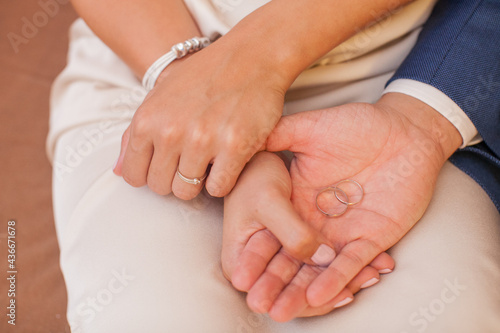 Pair of Wedding Rings On Opened Man's Palm. Groom holding in his hand two golden rings. Bride's Hand Holding Groom