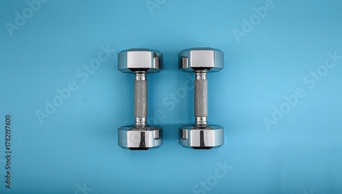 Pair of weights on a vibrant blue surface, gym and wellness theme from above