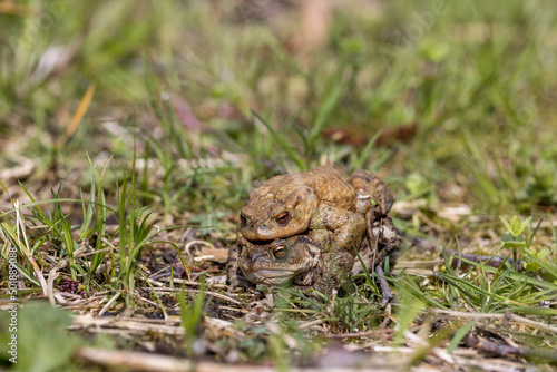 pairing of common toats (bufo bufo) in a meadow