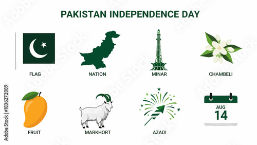 Pakistan Independence Day symbols featuring flag map minar flower fruit animal fireworks and calendar date