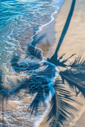Palm tree shadows on blue water background, palm branch on beach pattern, ocean wave sunlight palm shadow