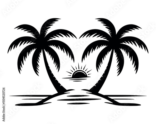 Palm Tree Sunset Beach Vector Silhouette, Tropical Beach Sunset with Palm Trees Silhouette Vector