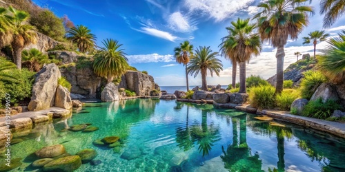 Palm trees surrounding a serene thermal pool on Ischia island, crystal clear water