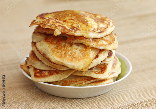 pancakes with honey on canvas background, close-up