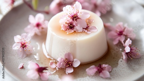 Panna cotta garnished with delicate cherry blossoms drizzled in syrup