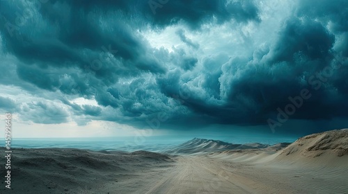 Panorama sand storm under dark cloudy sky with dust wave concept. A dramatic desert landscape under a stormy, cloud-filled sky.