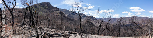 Panorama showing the damage from the 2025 bushfires started by lightning strikes in the Grampians (Gariwerd) National Park.