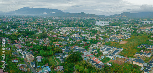 Panoramic aerial drone view of big city skyline scenery in Banda Aceh, Aceh, Indonesia.