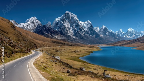 Panoramic Himalayan View With Snow Covered Mountains And Lake