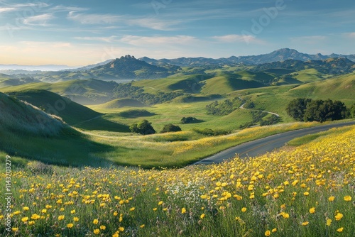 Panoramic mountain landscape rolling green hills yellow wildflower meadow