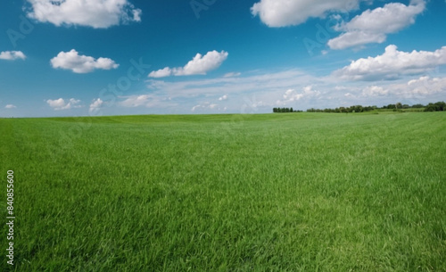 Panoramic Natural Landscape Green Grass Field, Blue Sky, and Mountains in Background, Summer Spring Meadow