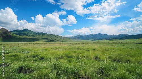 panoramic photo of green grassland with mountains on the background under blue skies