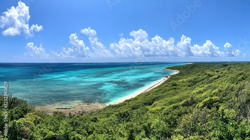 Panoramic tropical scene with turquoise ocean, white sandy beaches, and lush greenery under a clear, blue sky
