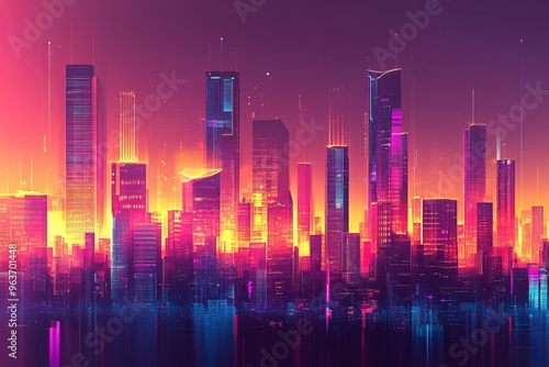 Panoramic urban architecture, cityscape with space and neon light effects. Modern hi-tech, science, futuristic technology concept. generative ai