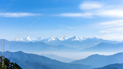 Panoramic View of Blue Hued Mountain Range Under a Clear Blue Sky