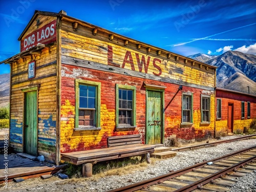 Panoramic View of Cracking Paint on the Side of Laws Railroad Museum in Bishop, California - Capturing Rustic Charm and Historical Details in a Scenic Landscape
