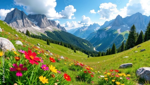 Panoramic view of Dolomiten Steingarten landscape with colorful wildflowers and rocky terrain in summer, Dolomites Steingarten, nature