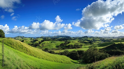 Panoramic view of gentle green hills under a vivid blue sky, with fluffy white clouds casting soft shadows on the vibrant landscape